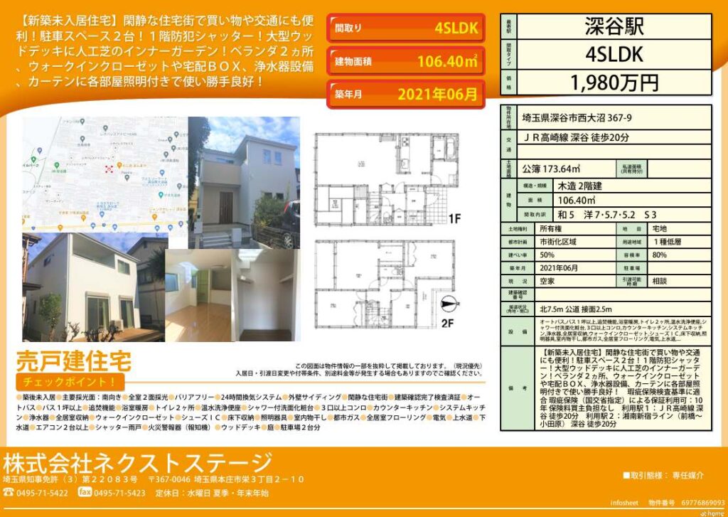 | 所在地 | 埼玉県深谷市西大沼367-9 深谷市西大沼 新築未入居住宅 | ||